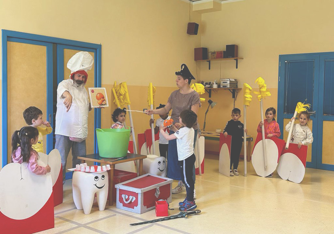 Da oltre 25 anni svolgo gratuitamente attività di prevenzione precoce presso scuole primarie e dell'infanzia e ho sviluppato un approccio didattico che consiste nel far divertire i bambini con uno spettacolo interattivo a tema igiene orale e prevenzione, durante il quale effettuo un'analisi del quadro clinico del bambino mentre lui gioca e si diverte.
